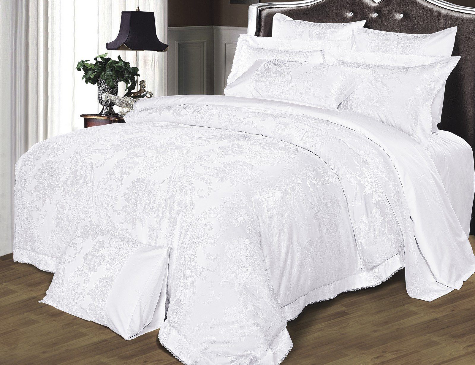 Белоснежный комплект с фантастическими цветами. Жаккардовый узор настолько роскошный и эффектный, что мы не стали дополнительно перегружать его вышивкой, а ограничились изящной мережкой по канту-ушкам и воздушными петельками тонкого ажурного кружева по краю ушек.