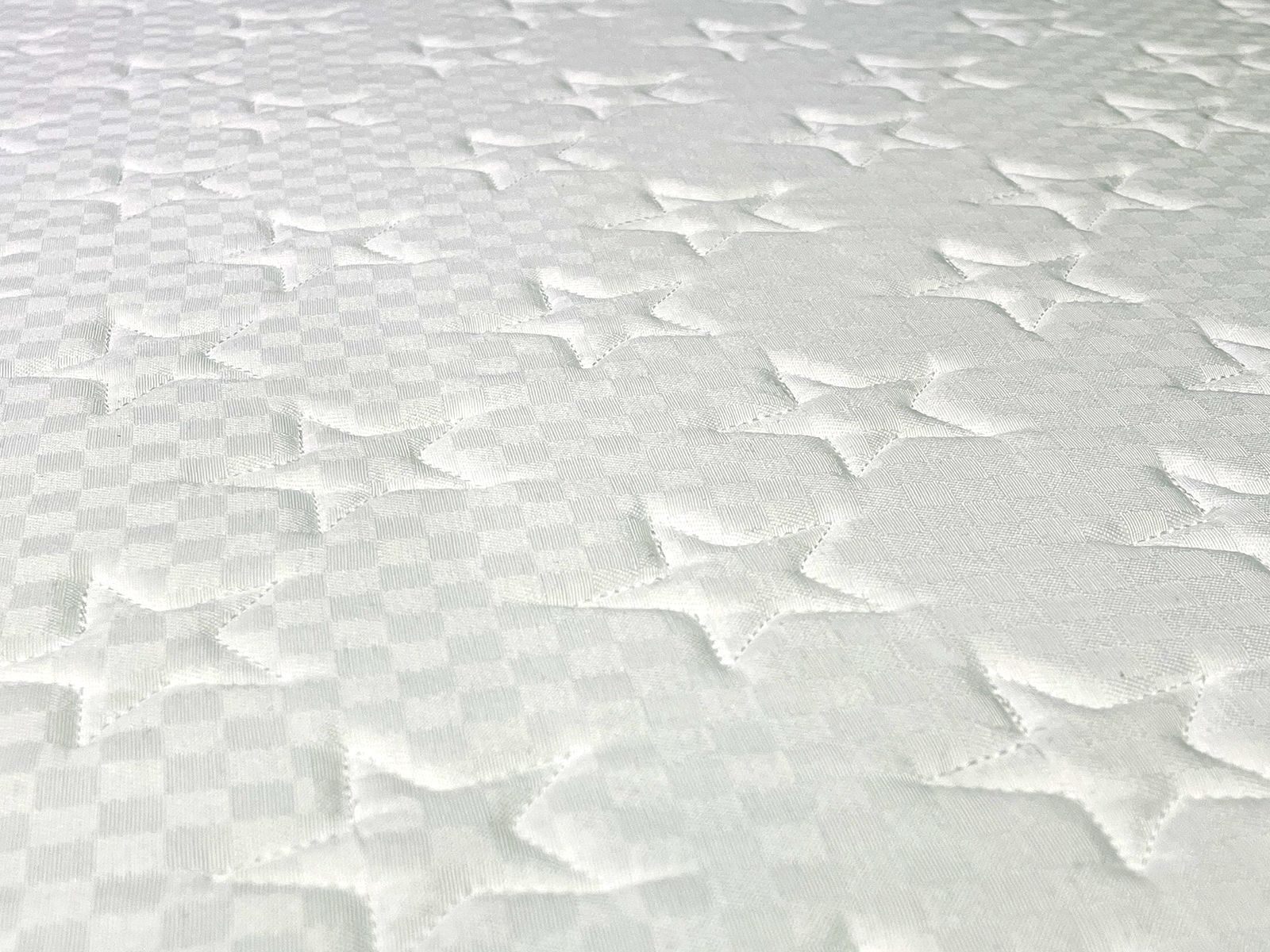 Для пошива чехла используется дышащий хлопковый жаккард. Материал украшает стёжка в виде звёзд по всем сторонам матраса. Стильное решение: вместо канта по периметру матраса вшита удобная смотровая молния в глубоком фиолетовом цвете.