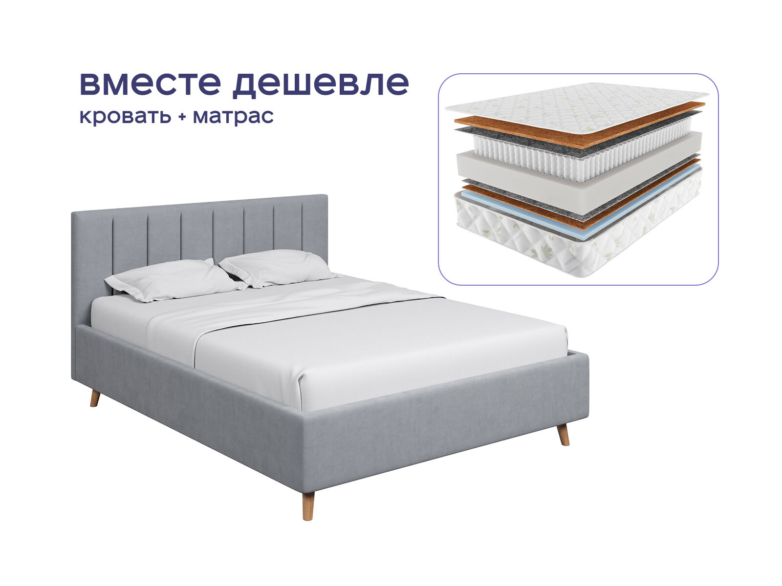Кровать получила лёгкий и элегантный дизайн. Изголовье с мягкими вертикальными секциями украсит любую спальню и добавит уюта месту отдыха. Изящные наклонные ножки из дерева визуально облегчают конструкцию и обеспечивают просвет над полом, где легко пройдёт робот-пылесос. Корпус кровати выполнен из ДСП. Для обивки кровати используется велюр – мягкий и бархатный материал, который предпочитают ценители нежных прикосновений. В комплект входит ортопедическое металлическое разборное основание.