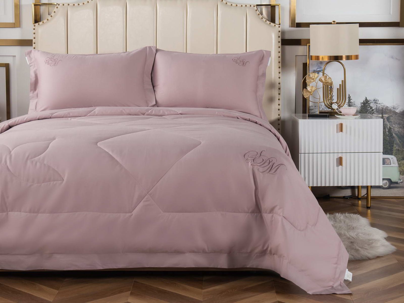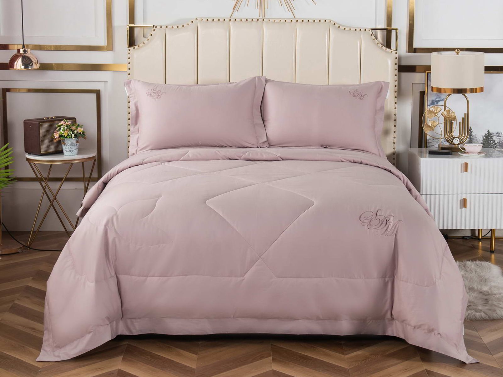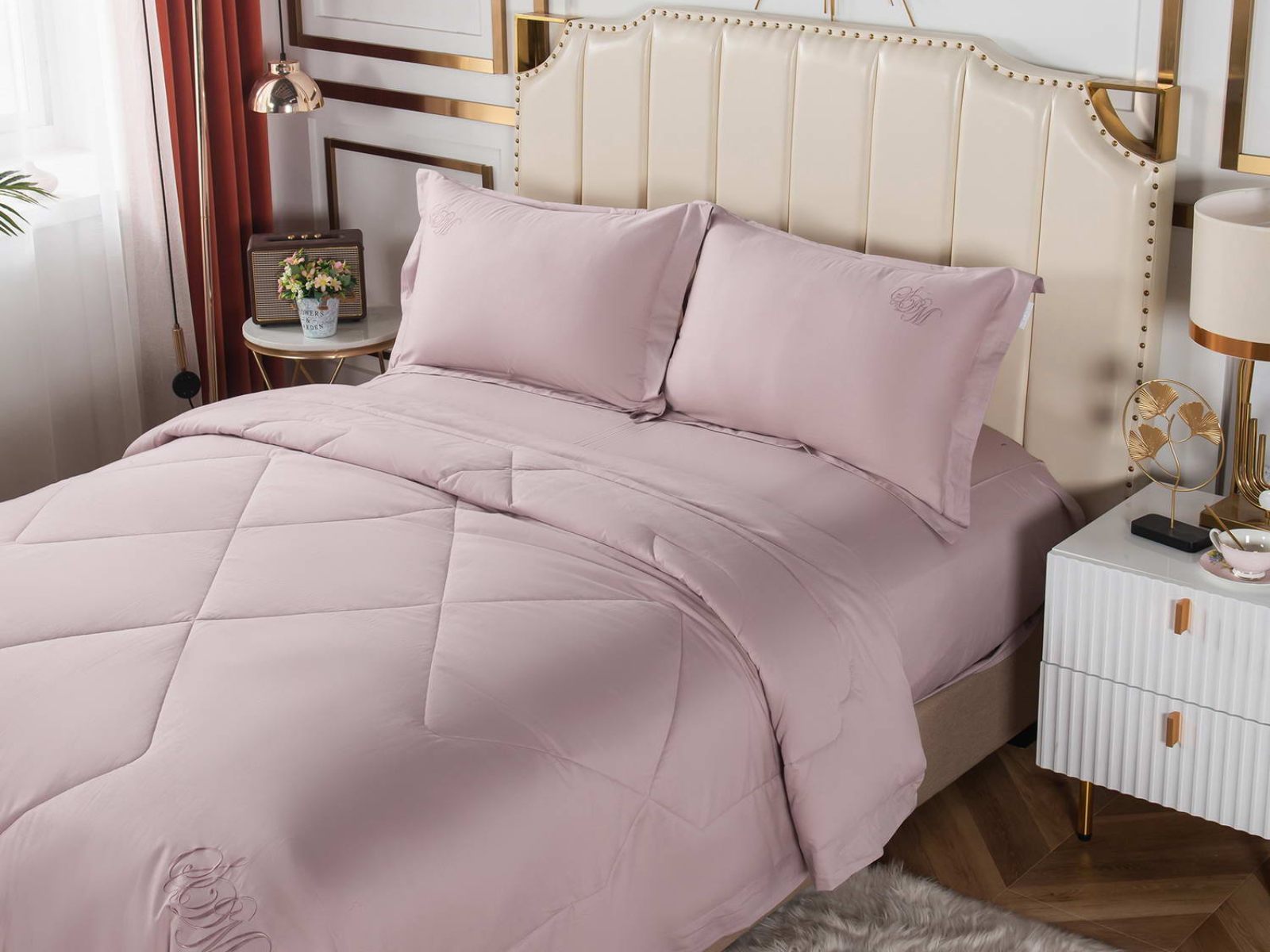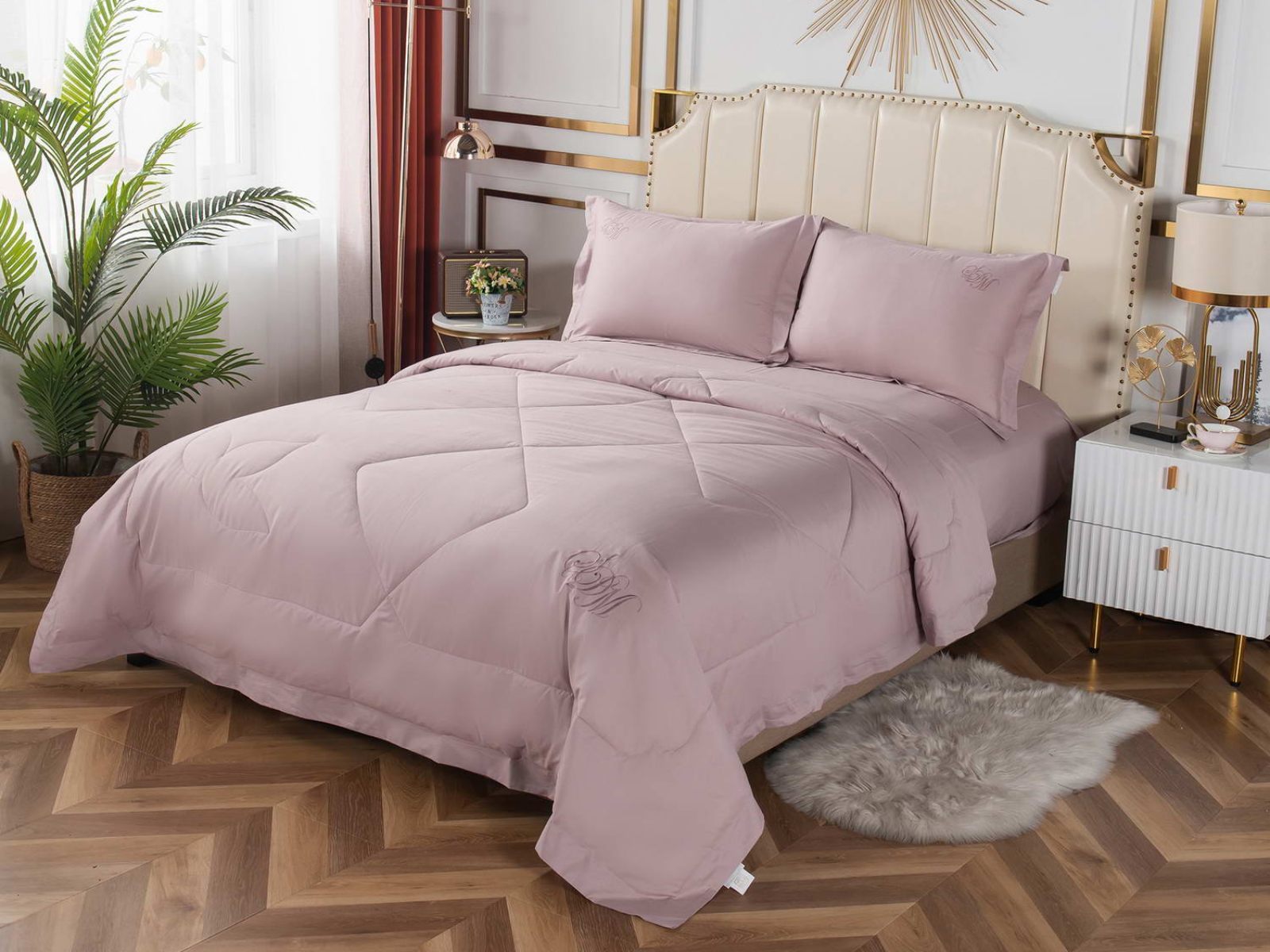 В комплект входят простыня, наволочки и одеяло. Одеяло простеганное, легкое и воздушное, его можно стирать в стиральной машине. Благодаря микроволокну в составе наполнителя для одеяла, оно всегда принимает свою начальную форму.