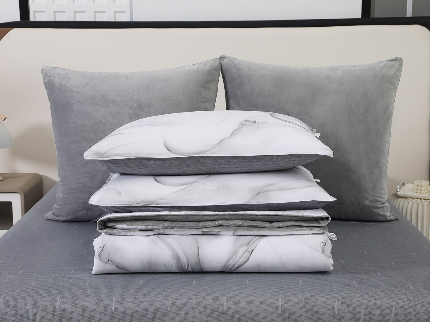 Обратная сторона одеяла – принтованный сатин натуральный хлопковый материал. На ощупь нежная и шелковистая, при этом комфортная и прочная ткань.
