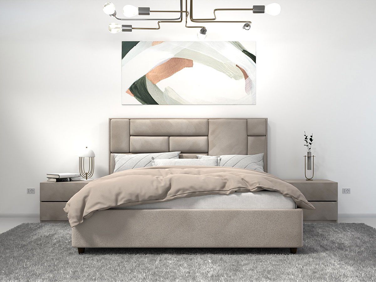 Лаконичная кровать Simona, оформленная с геометрическими вставками, гармонично дополнит любой современный интерьер.