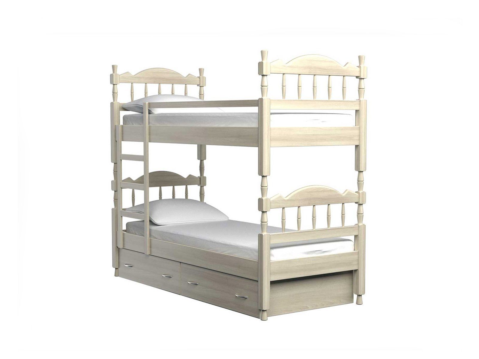 Удобная двухъярусная детская кровать с ящиками для хранения постельных принадлежностей и надежно закрепленной лестницей. Для обеспечения безопасности ребенка второй ярус оснащен бортиком-ограничителем, исключающим падение ребенка во время сна. Деревянная кровать из массива ясеня выполнена по индивидуальной технологии. Детская кровать подарит больше пространства и идеально впишется в интерьер детской комнаты. Вместительные встроенные ящики прекрасно позаботятся об игрушках и постельных принадлежностях. Кровать полностью выполнена из натурального дерева. Кровати из массива ценных пород дерева – гарантия экологической чистоты в Вашем доме.