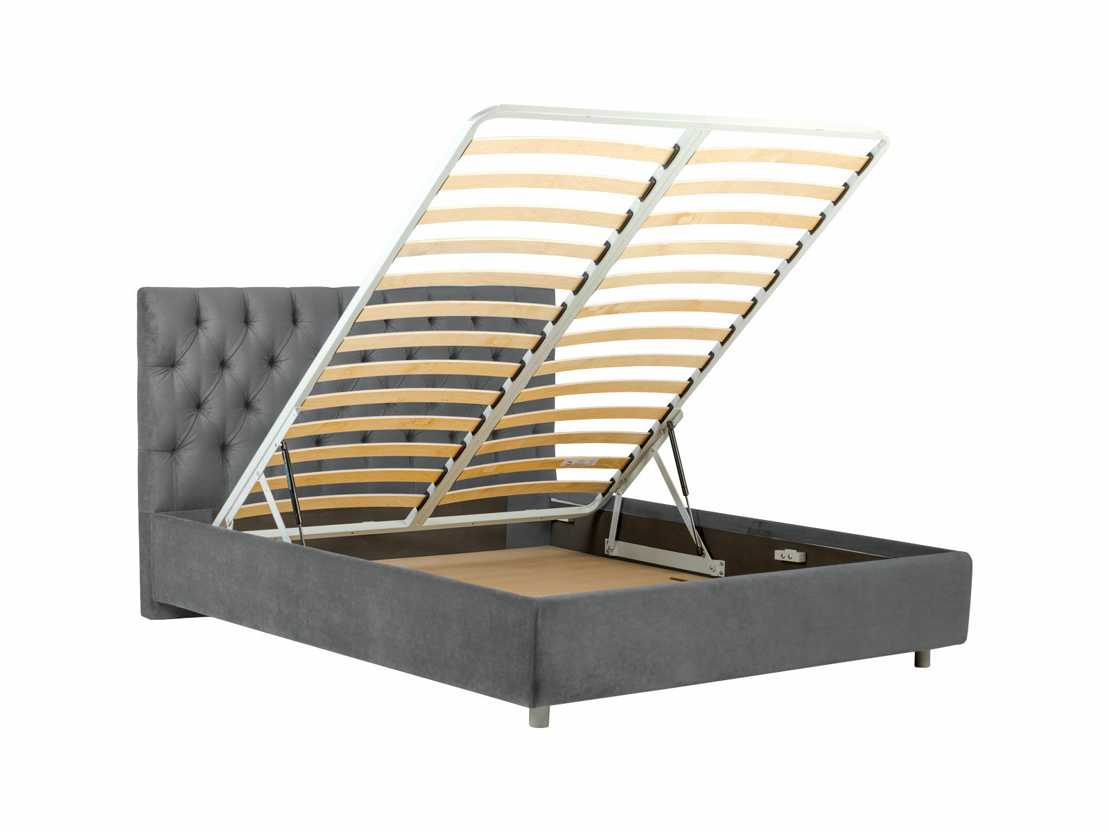 Кровать оснащена основанием с ламелями и подъемным механизмом. Рекомендуемая высота матраса от 13 см, вес матраса до 50 кг.