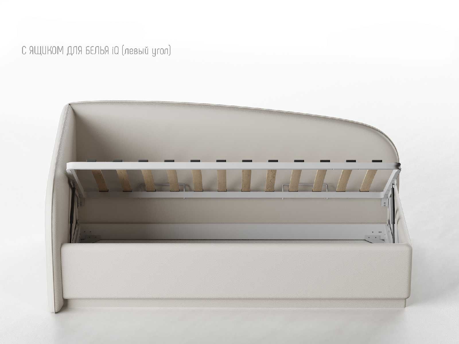 Кровать укомплектована IQ с подъемным механизмом и ящиком для белья без дна (дополнительная платная опция - дно к ящику IQ из HDF (ХДФ). Каркас кровати на цоколе, декоративный чехол на цоколе съёмный. Глубина ящика для белья - 30 см, без ограничения нагрузки на ящик.