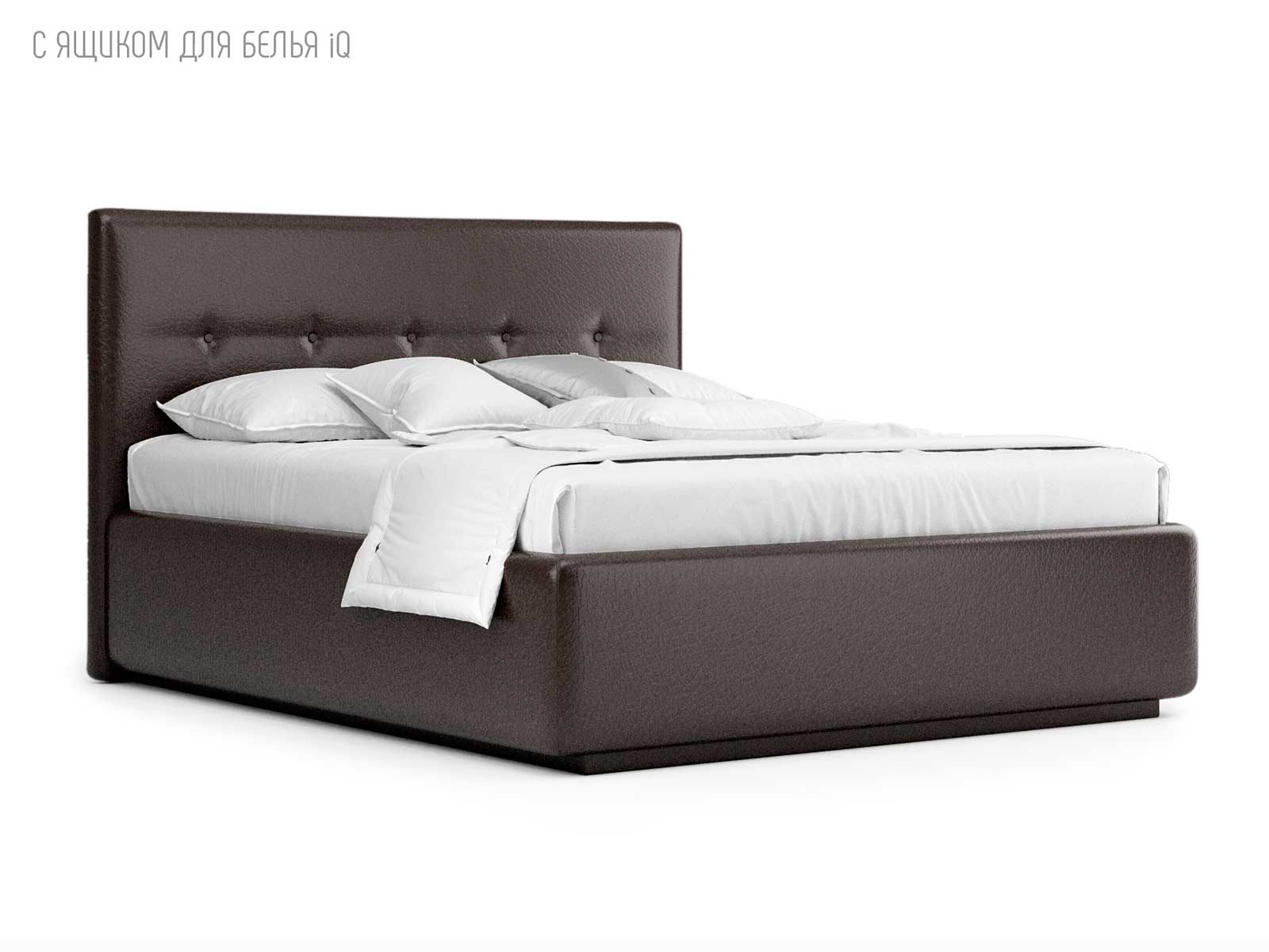 Кровать укомплектована IQ с подъемным механизмом и ящиком для белья без дна (дополнительная платная опция - дно к ящику IQ из HDF (ХДФ). Каркас кровати на цоколе, декоративный чехол на цоколе съёмный. Глубина ящика для белья - 30 см, без ограничения нагрузки на ящик.