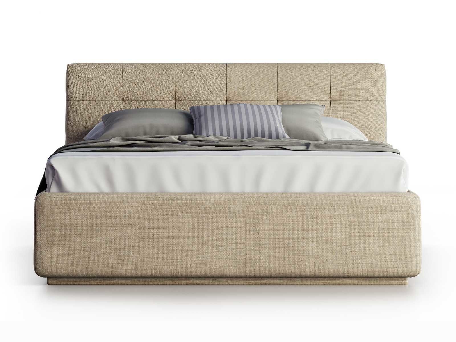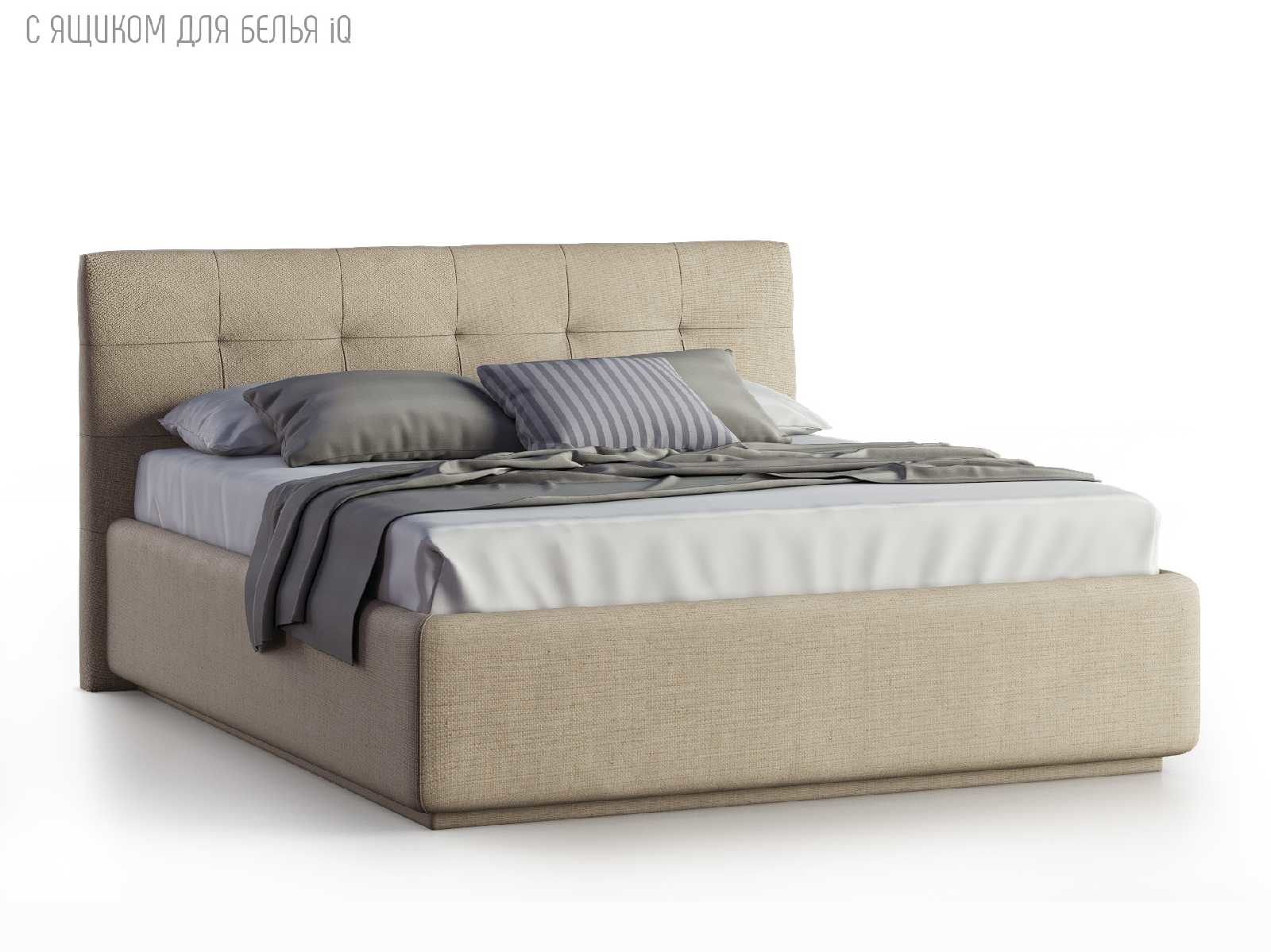 Кровать укомплектована IQ с подъемным механизмом и ящиком для белья без дна (дополнительная платная опция - дно к ящику IQ из HDF (ХДФ). Каркас кровати на цоколе, декоративный чехол на цоколе съёмный. Глубина ящика для белья - 30 см, без ограничения нагрузки на ящик.