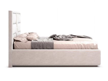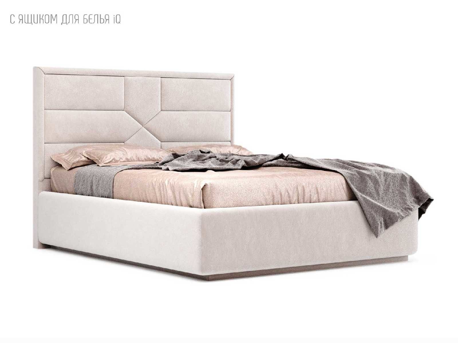 Кровать укомплектована IQ с подъемным механизмом и ящиком для белья без дна (дополнительная платная опция - дно к ящику IQ из HDF (ХДФ). Каркас кровати на цоколе, декоративный чехол на цоколе съёмный. Глубина ящика для белья - 30 см, без ограничения нагрузки на ящик.