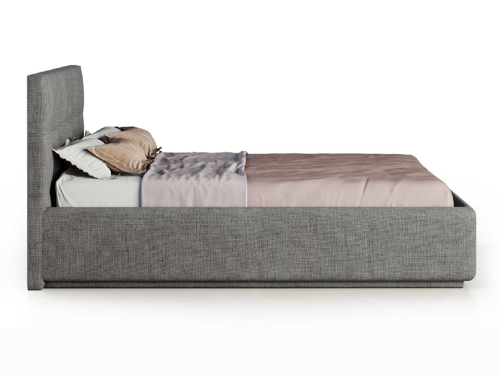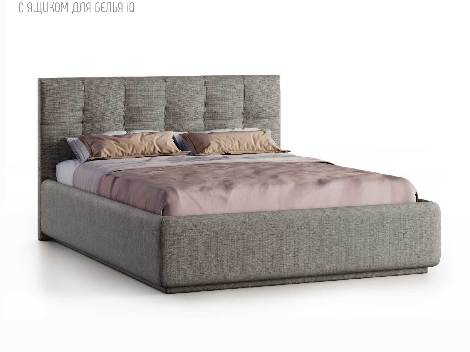 Кровать укомплектована IQ с подъемным механизмом и ящиком для белья без дна (дополнительная платная опция - дно к ящику IQ из HDF (ХДФ). Каркас кровати на цоколе, декоративный чехол на цоколе съёмный. Глубина ящика для белья - 30 см, без ограничения нагрузки на ящик.