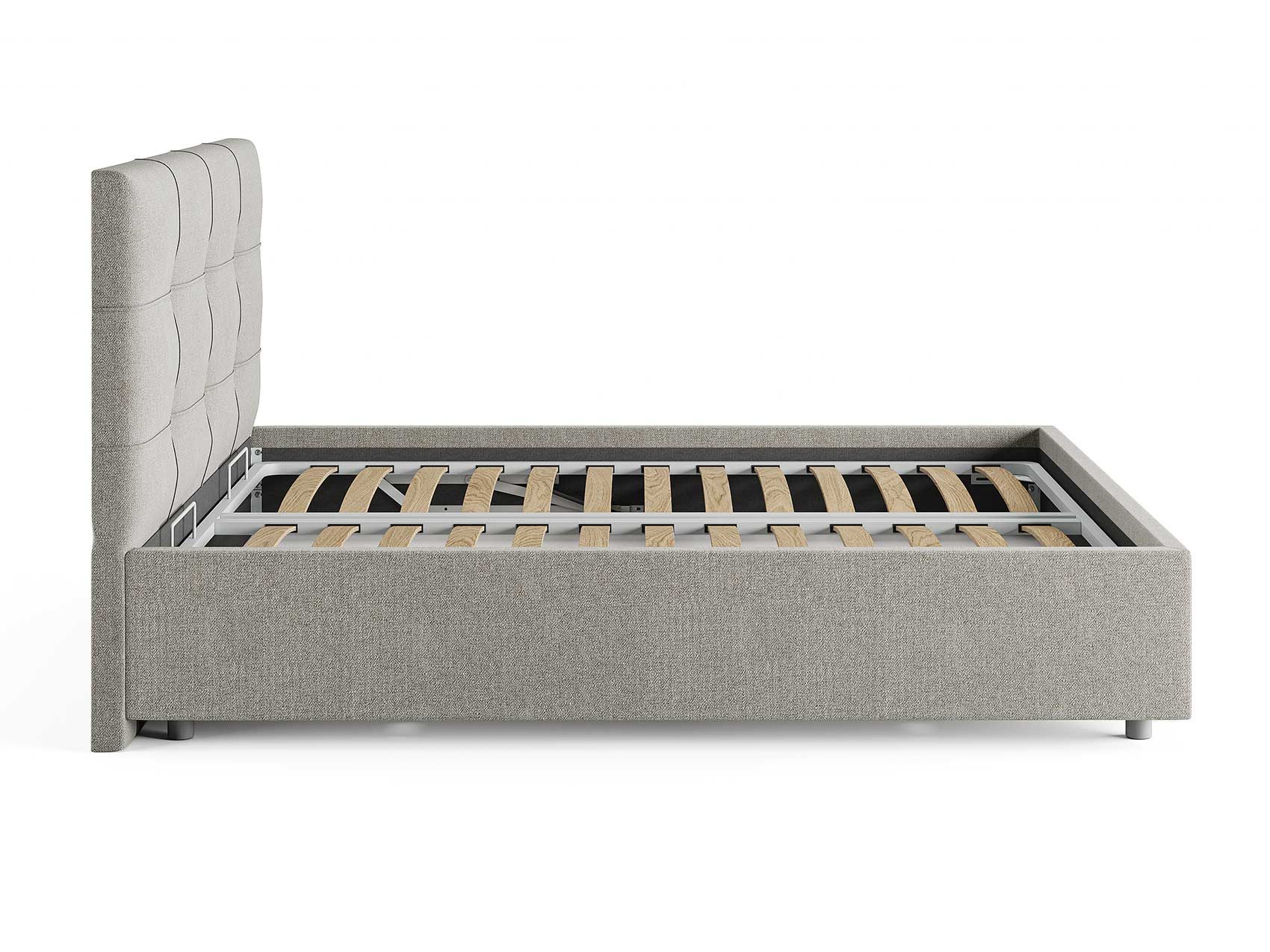 Кровать комплектуется металлическим основанием и подъемным механизмом со вместительным бельевым ящиком. Дно бельевого ящика легко сдвигается для обеспечения уборки под кроватью.
