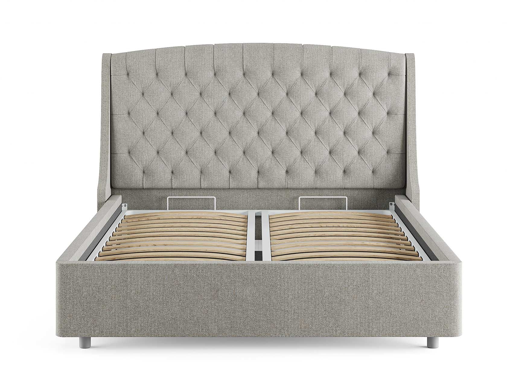 Кровать комплектуется металлическим основанием (без опор), которое имеет 13 рядов встроенных березовых ламелий на каждое спальное место, обеспечивая равномерное распределение нагрузки.