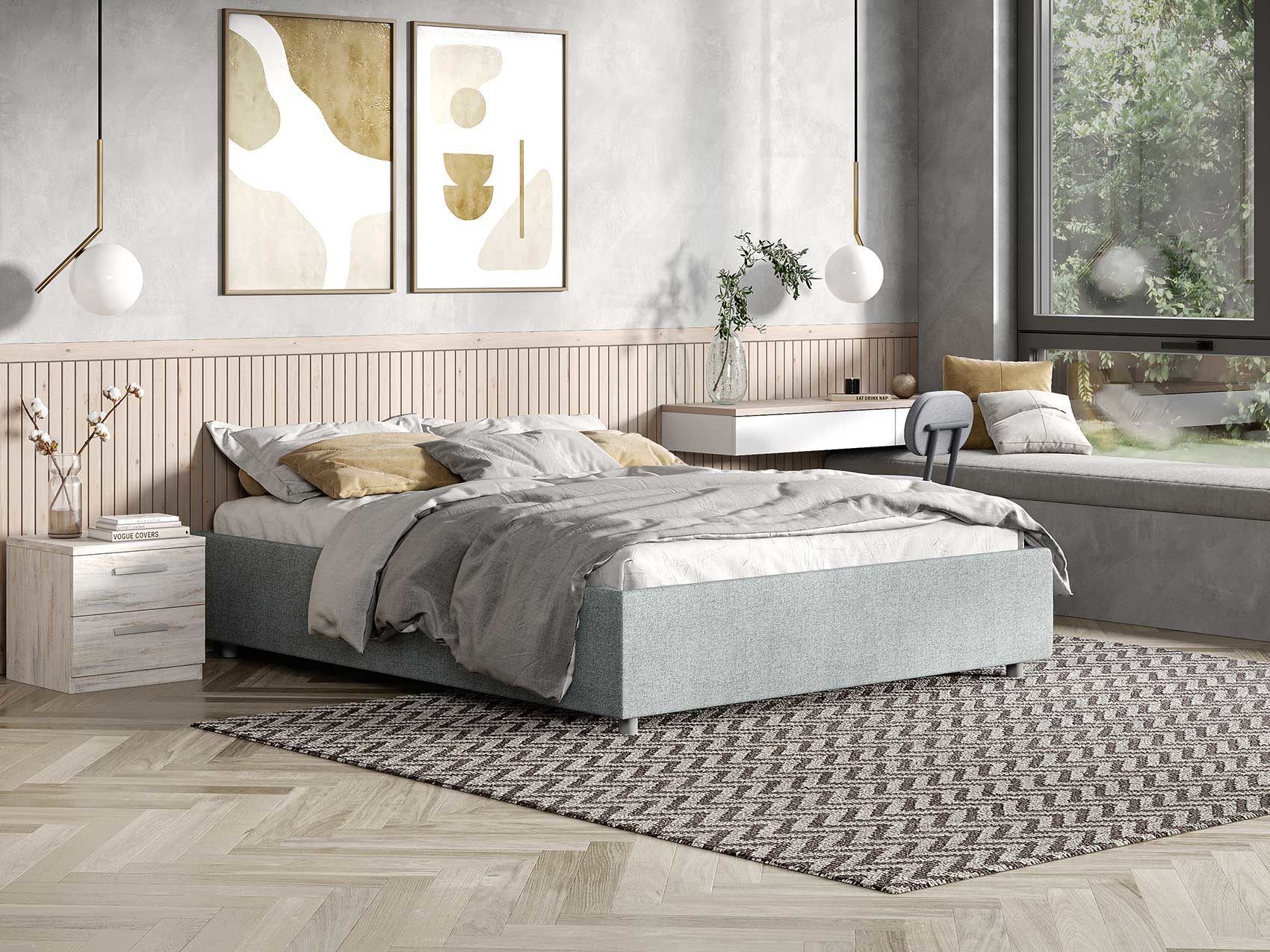 Стильная интерьерная кровать без спинки. Модель изготовлена из ДСП. Преимуществом кровати являются съемные чехлы царг, что позволяет легко ухаживать за обивкой или менять цвет кровати в зависимости от смены интерьера.