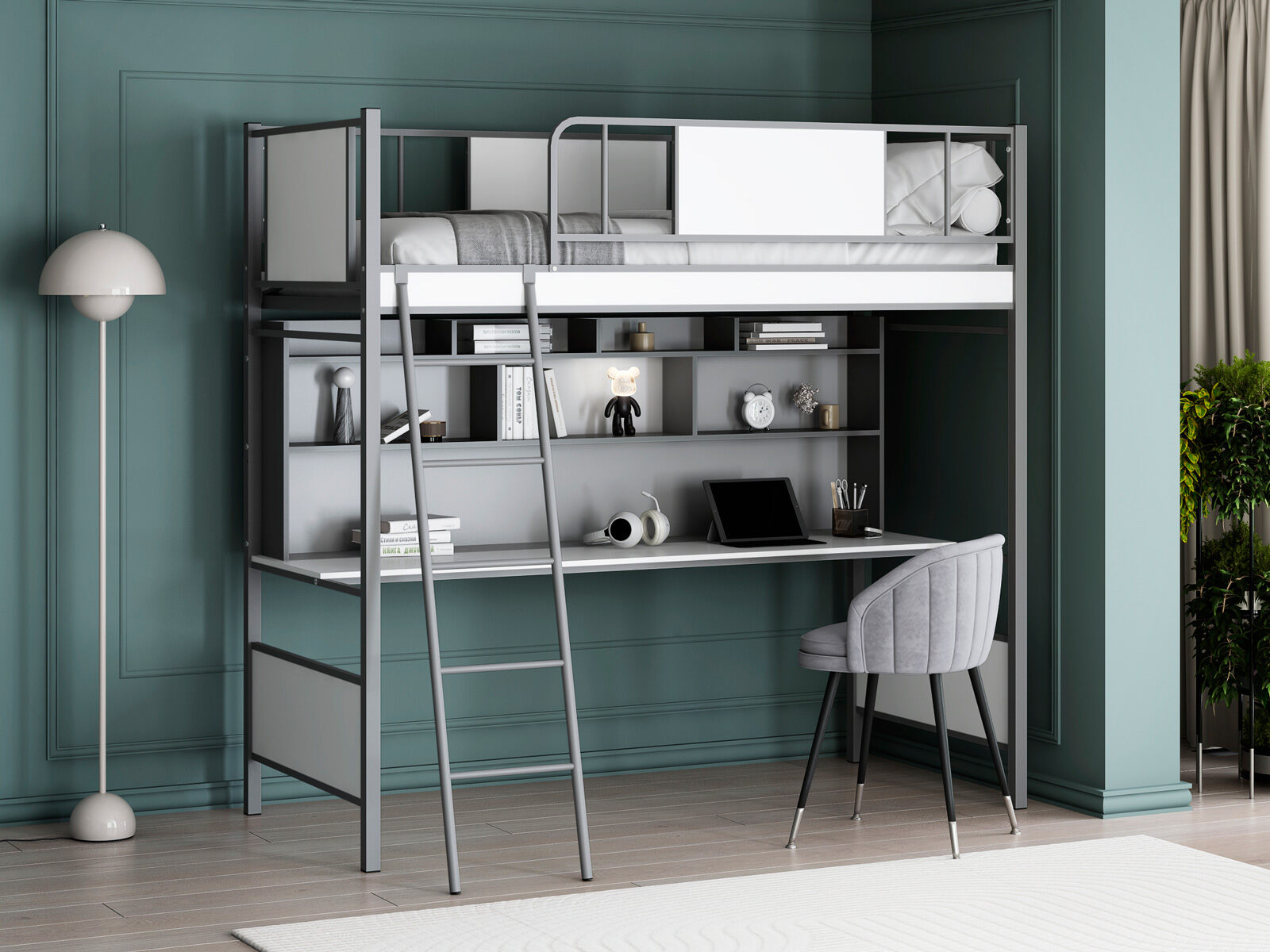 Модель оснащена столом с полками, что обеспечивает рабочее пространство для работы или учебы, а также металлической планкой под столешницей для дополнительной прочности.