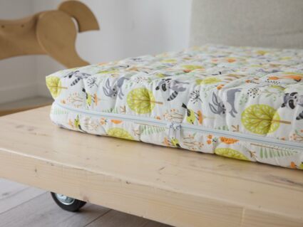 Матрас поставляется в красочном детском чехле из хлопковой бязи. Обивка имеет молнию, поэтому её удобно снимать для стирки и уходом за матрасом.