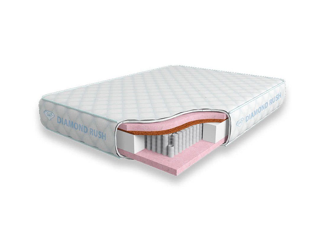 Матрас Diamond Rush Ergo Lux 1440DR имеет в своей основе независимый пружинный блок 1440, состоящий из пружин диаметром 3-4 см. В качестве настилочных слоев поверх пружинного блока используются листы уникального материала с памятью - Меморикса, а также латексированной кокосовой койры. Такой матрас является мягким, но стороны имеют небольшую разницу в жесткости, за счет одного сантиметра кокосовой койры.