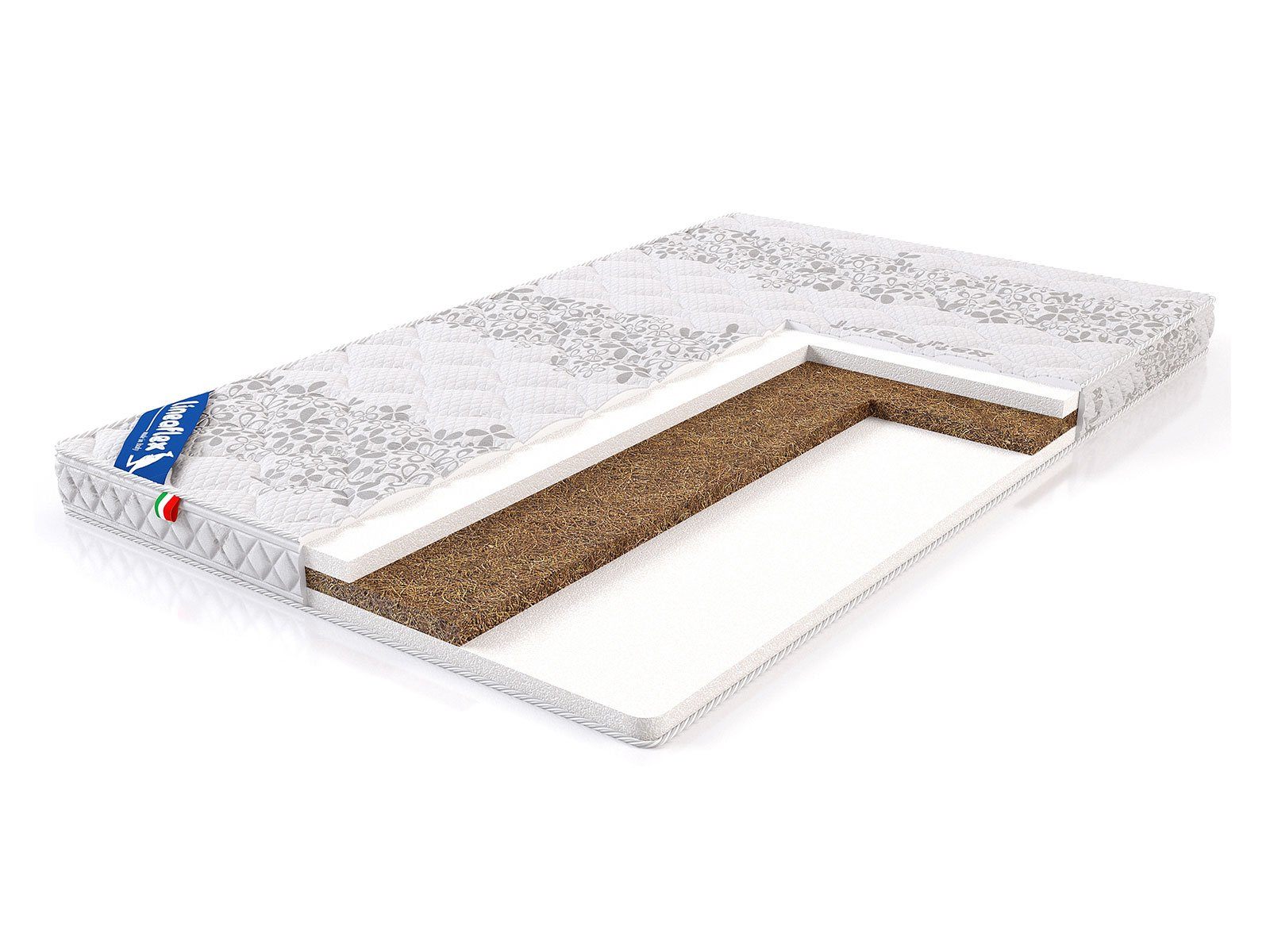 Койра кокоса установлена в центре матраса и служит той базой, на которую приходится основная нагрузка. По это причине материал выбран с высокой жёсткостью и большого объёма. 3 см полотно кокоса – это максимальная возможная толщина для единого полотна данного материала.