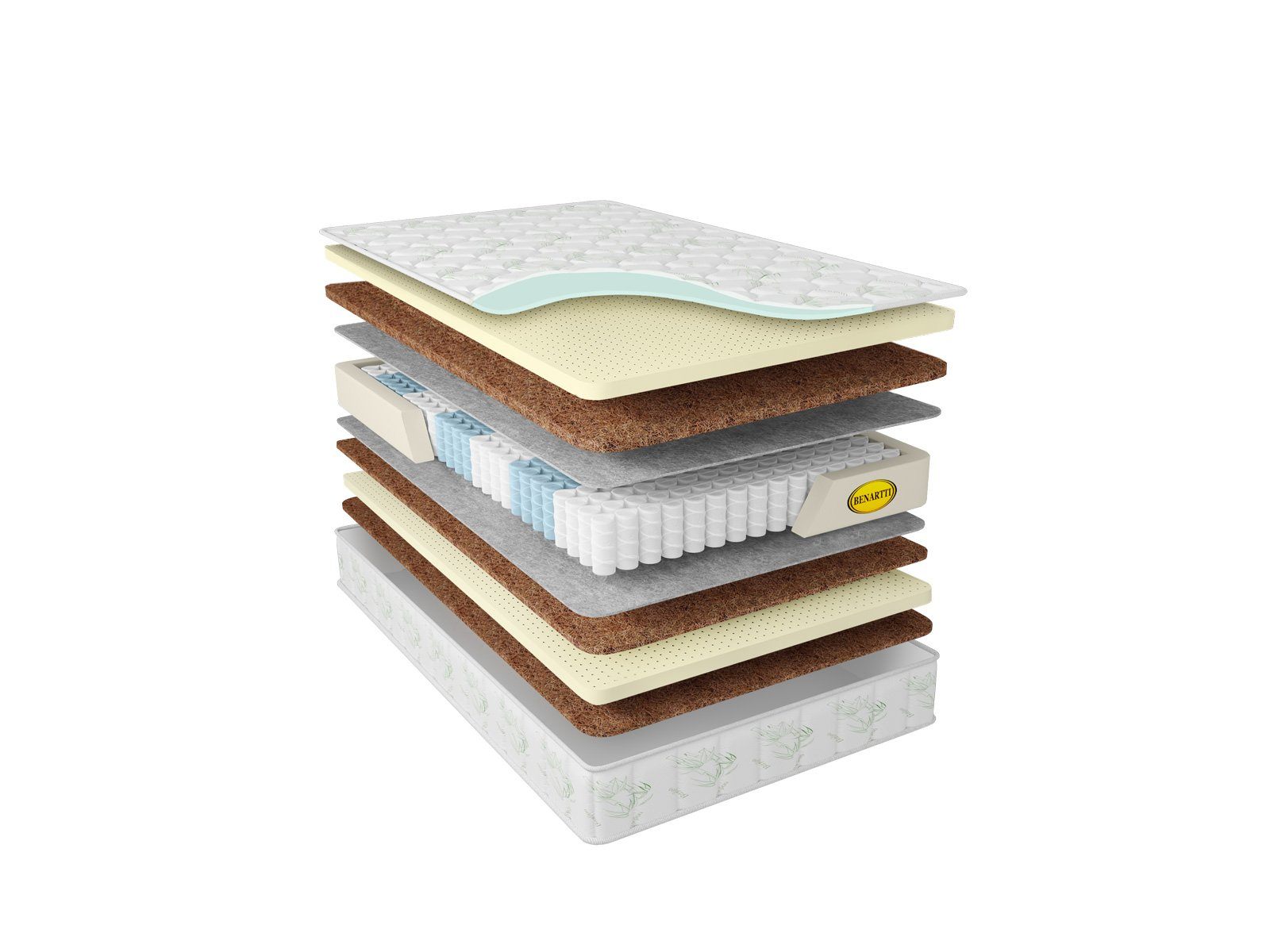 Внутри, кроме пружинного блока, установлены слои натуральных койры и латекса. Их различная комбинация с каждой из сторон обеспечивает средний и выше среднего уровни жёсткости поверхностей. Чтобы перевернуть изделие по бокам модели предусмотрены вшивные ручки.