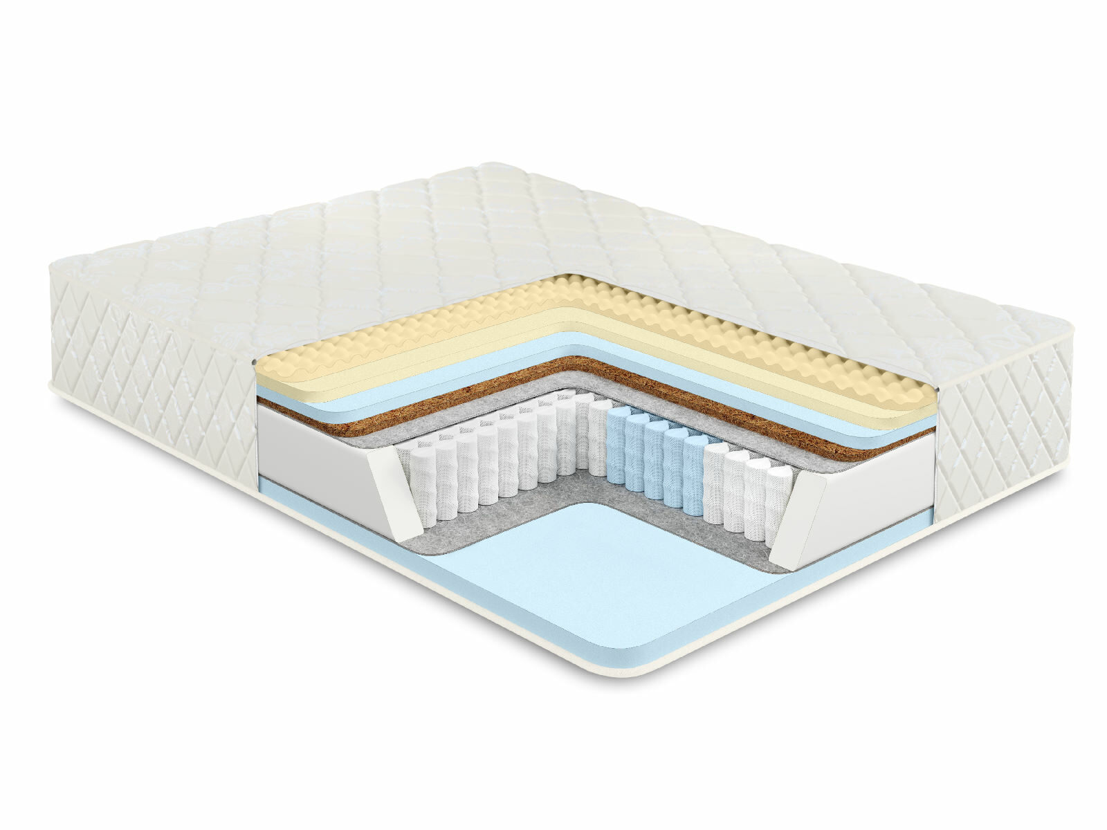Пружинный матрас в основе которого многозональный независимый пружинный блок 1000 пружин на спальное место обеспечивает ортопедическую поддержку и комфорт во время сна. Независимые пружины подстраиваются под формы человека, потому что каждая пружина находится в отдельном кармашке и обеспечивает равномерное распределение веса.