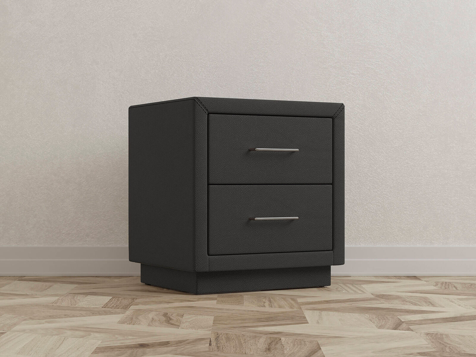 Прикроватная тумба с двумя выдвижными ящиками сочетается с любыми моделями кроватей, органично вписывается в интерьер практически любого стиля. Каркас тумбы выполнен из ДСП. Каркас тумбы и фасад ящиков покрыты обивочным материалом. Для удобства использования и продления срока эксплуатации, рекомендуется использовать стеклянную накладку. Накладка используется в качестве столешницы для тумбы и защищает ее от повреждений и загрязнений. Стеклянная столешница заказывается дополнительно