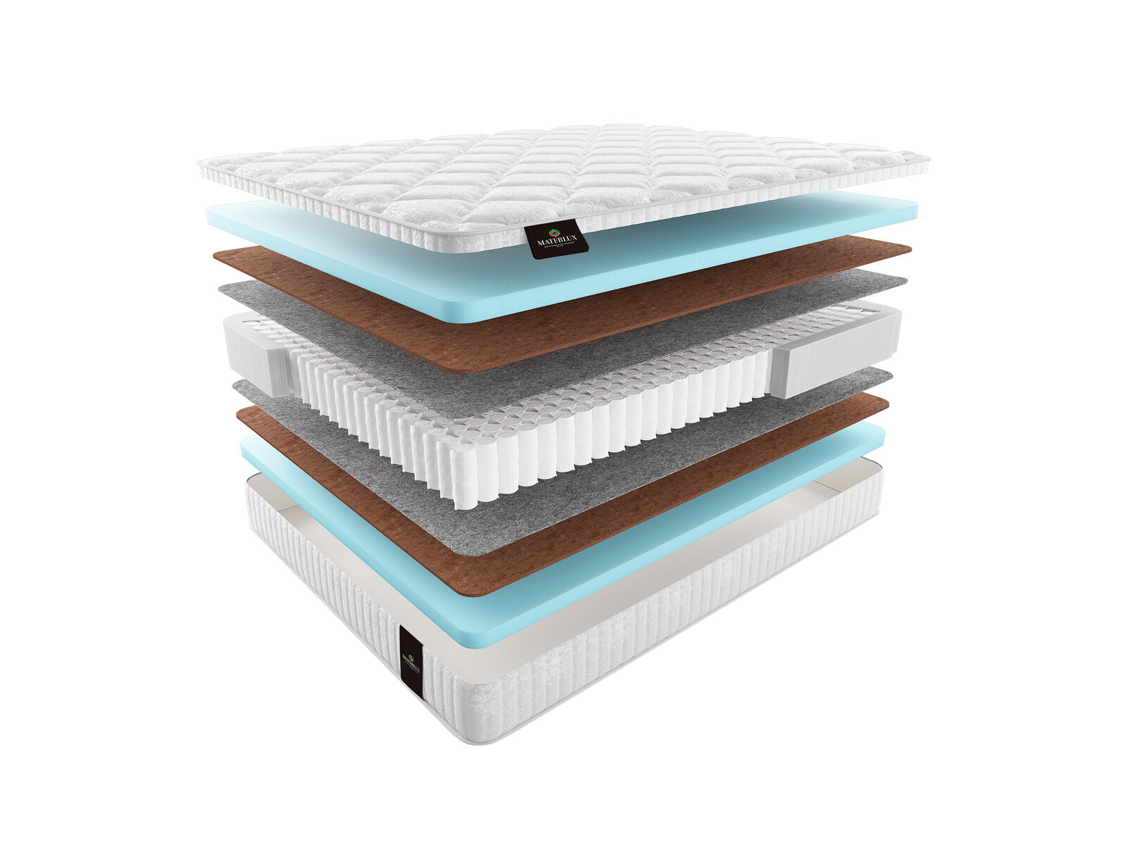 Латексированный кокос (1 и 3 см; пл 85): обеспечивает стойкость и долговечность матраса, этот материал предотвращает его проваливание и изменение формы. Кроме того, он обладает превосходными ортопедическими* характеристиками, поддерживая правильное положение позвоночника.