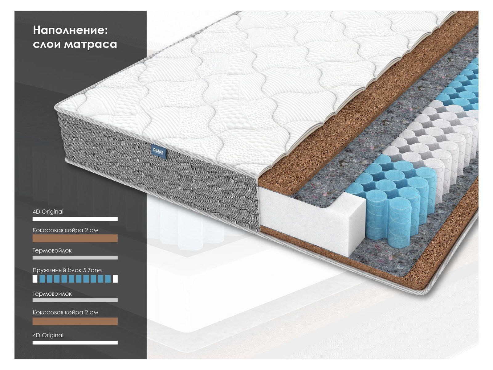 Димакс ОК Хард – это ортопедический матрас с жёсткостью сторон выше среднего, предназначенный для тех, кто предпочитает спать на твёрдой и упругой поверхности. Основой служит независимый пружинный блок, усиленный пятизональной системой, а жёсткость придаёт слой кокосовой койры. Модель выдерживает нагрузки до 130 кг на спальное место.