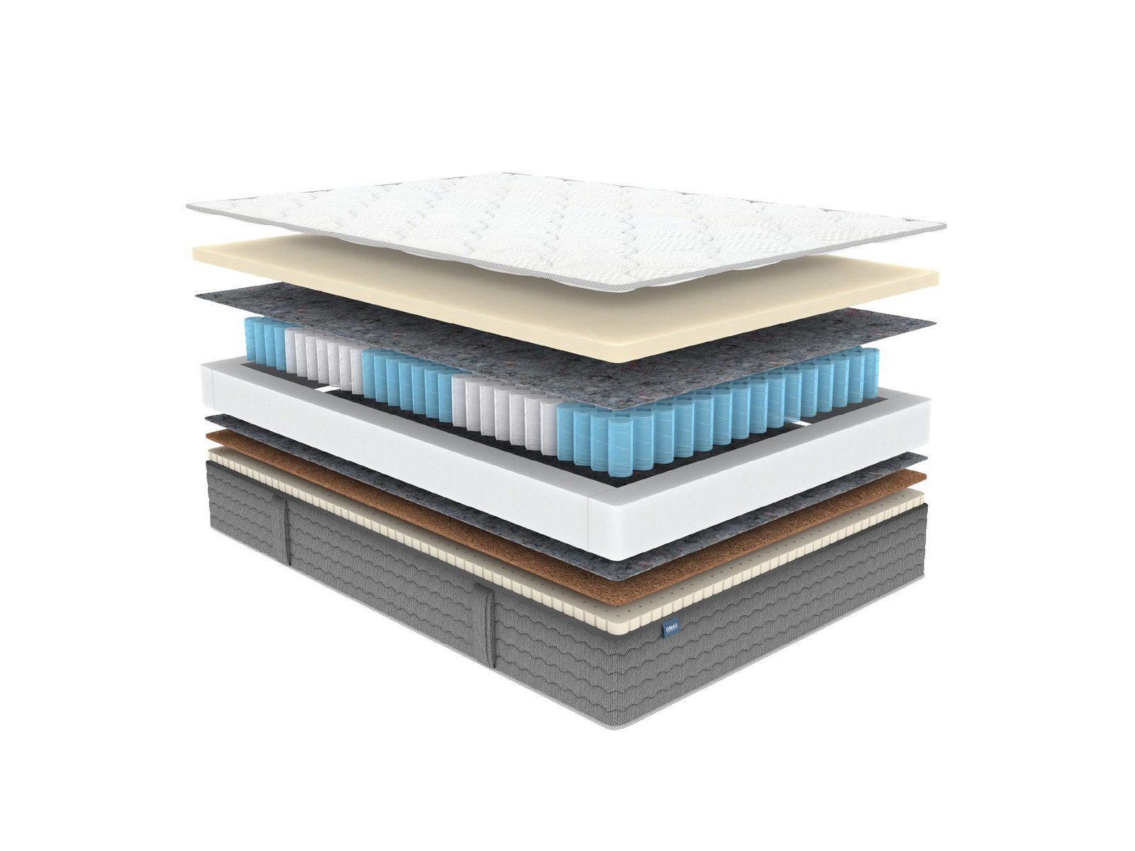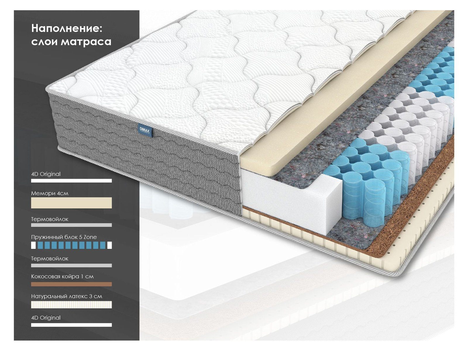 Матрас сочетает природный комфорт от кокоса и латекса на одной стороне с нежной пеной Мемори на другой, а 5-зональный блок гарантирует точечную ортопедическую поддержку.