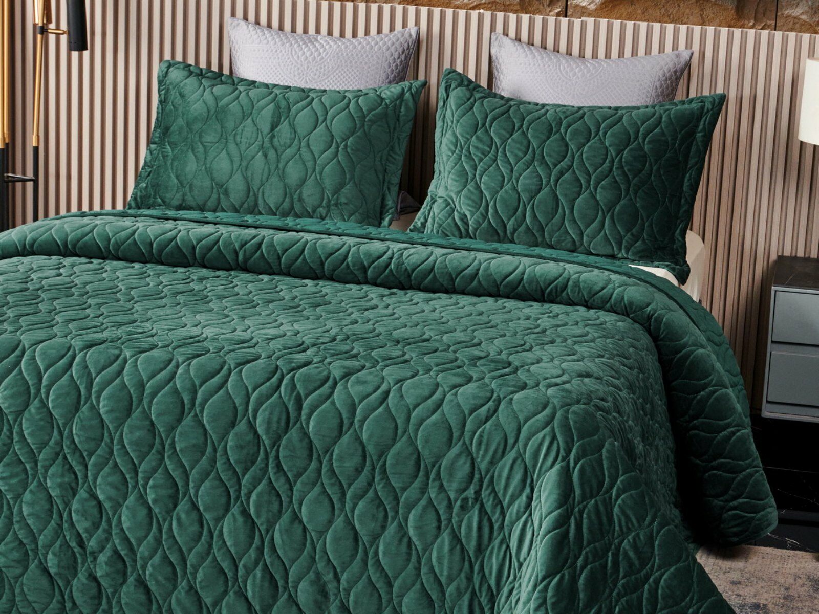 Покрывала и наволочки изготовлены из велюра высокой плотности - приятной на ощупь бархатистой ткани с коротким ворсом. Пошив покрывала с кантом, наволочки с ушками 5 см.