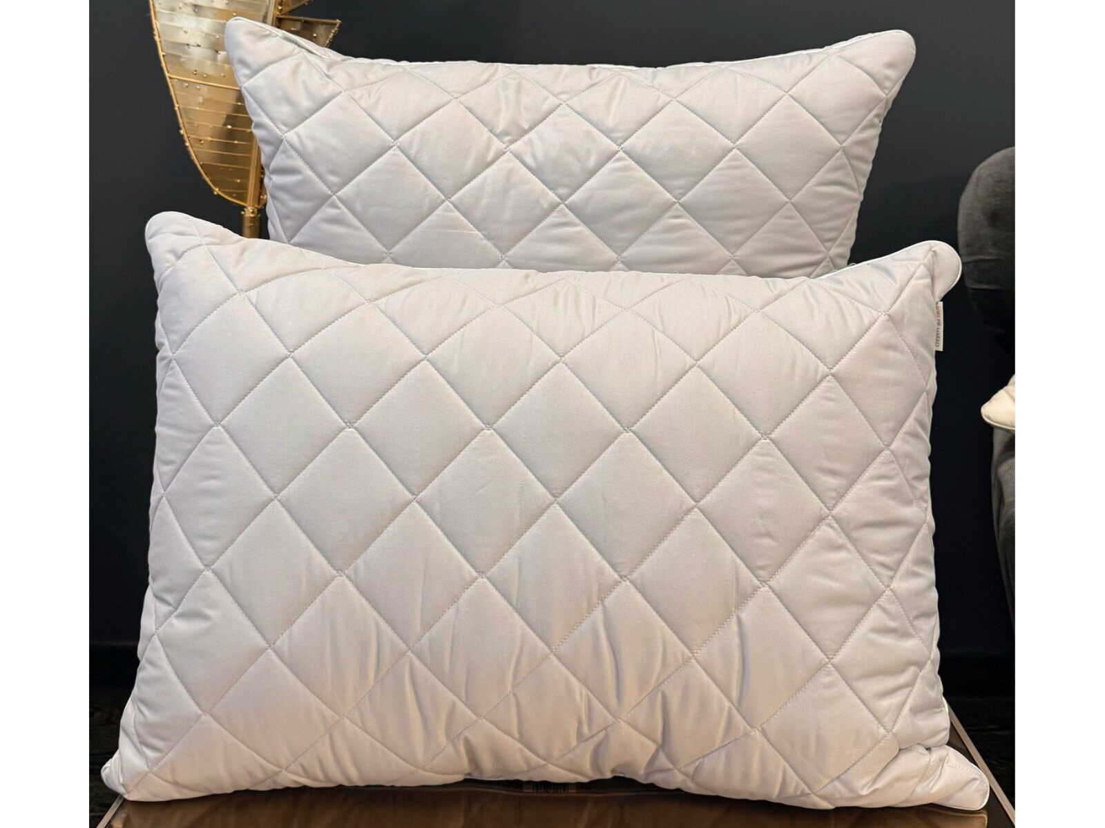Наполнителем для подушек служит искусственный лебяжий пух, он обладает отличной формоустойчивостью, не сбивается в комки и прост в уходе. Особенность данной модели - уникальная стежка «ромбы», которая хорошо переносит ежедневную эксплуатацию, без потери своих качеств.