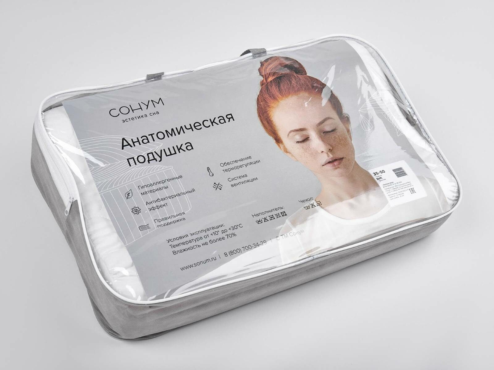 Подушка Soft эргономичной формы уменьшенного размера. Подушка изготовлена из гипоаллергенного материала Foam, который реагирует на давление и тепло. Подушка Софт идеально подстраивается под форму головы и шеи. Поставляется в съемной наволочке на молнии