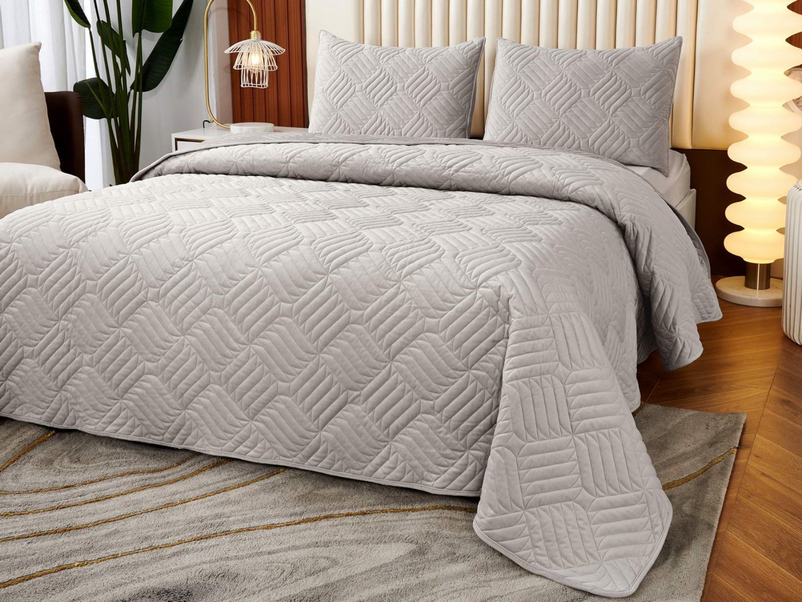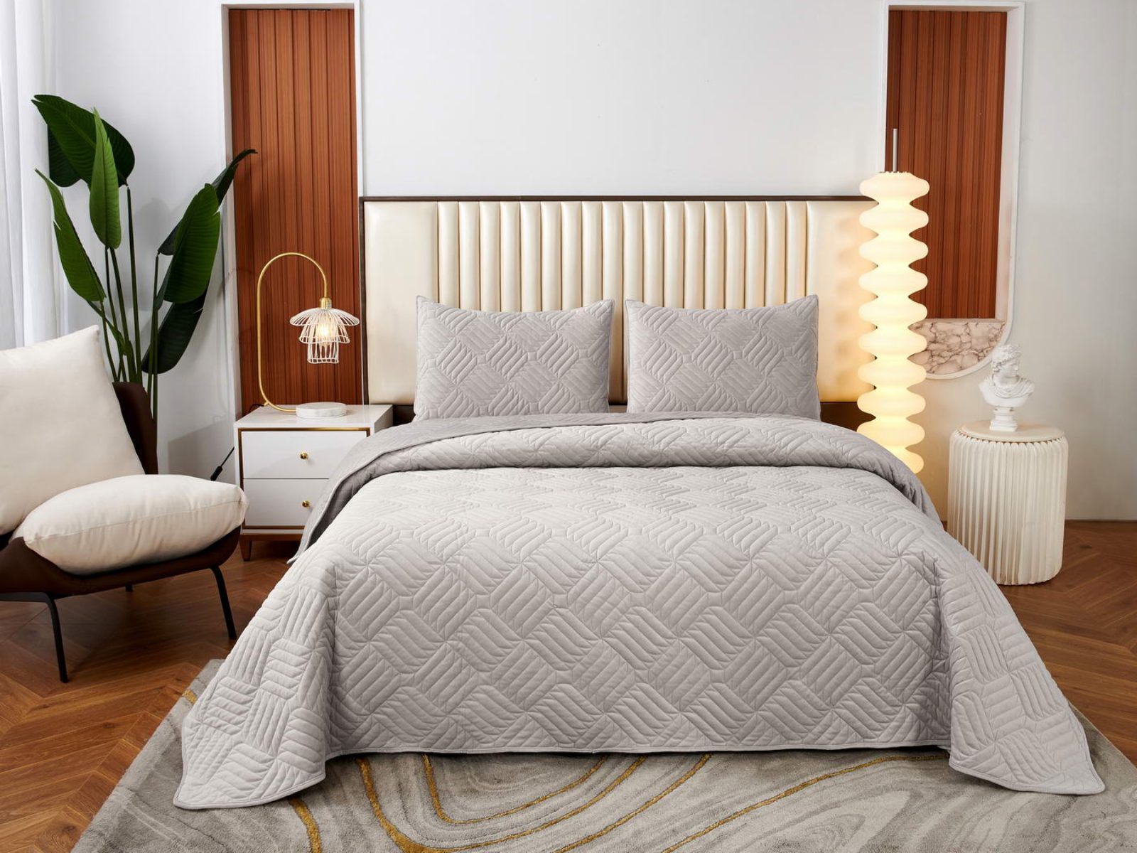 В комплект входят покрывало и одна либо две наволочки (50х70 см) из аналогичного материала в зависимости от размера. Каждый набор заботливо упакован в фирменную подарочную сумку.Покрывало стеганое с графическим узором. Пошив покрывала с кантом, наволочки на запахе, декорированы ушками 5 см.