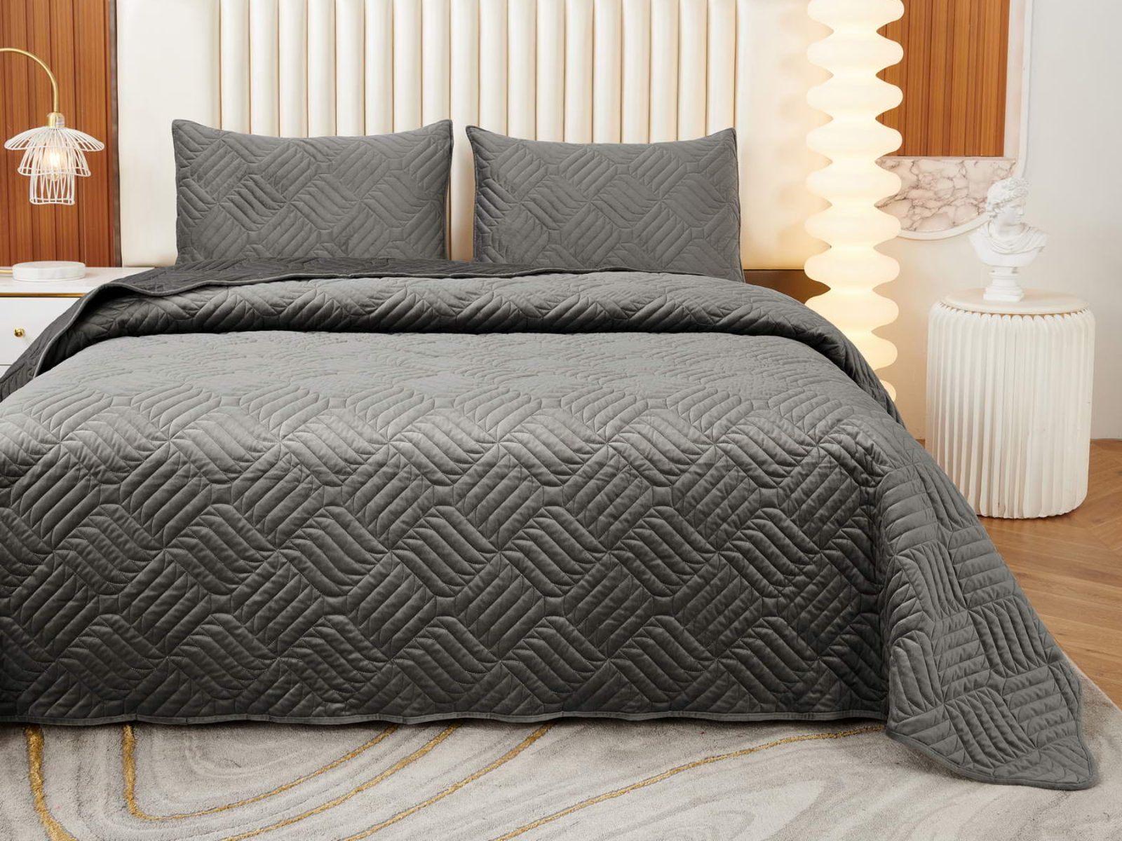 В комплект входят покрывало и одна либо две наволочки (50х70 см) из аналогичного материала в зависимости от размера. Каждый набор заботливо упакован в фирменную подарочную сумку.Покрывало стеганое с графическим узором. Пошив покрывала с кантом, наволочки на запахе, декорированы ушками 5 см.