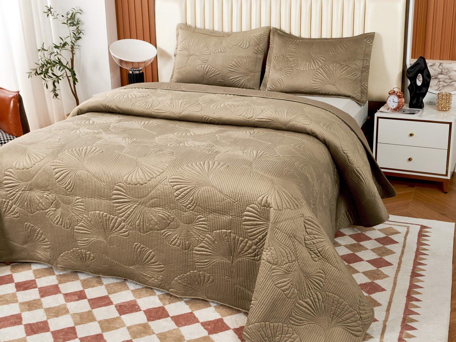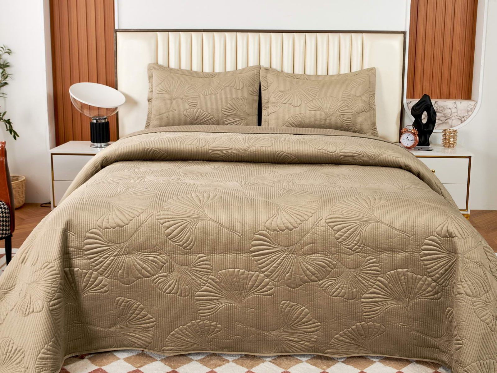Роскошный растительный орнамент в виде вышивки добавит Вашей спальне элегантности и изысканности. Текстура цветочного узора будет сочетаться с другими элементами интерьера, такими как шторы, подушки, ковры и т.д.