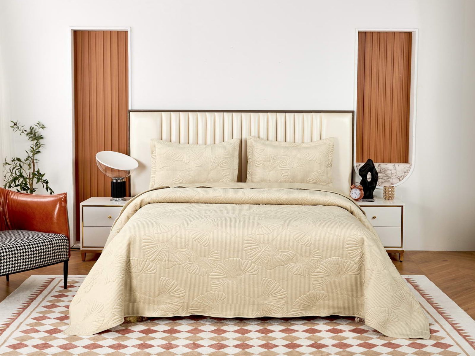 Роскошный растительный орнамент в виде вышивки добавит Вашей спальне элегантности и изысканности. Текстура цветочного узора будет сочетаться с другими элементами интерьера, такими как шторы, подушки, ковры и т.д.