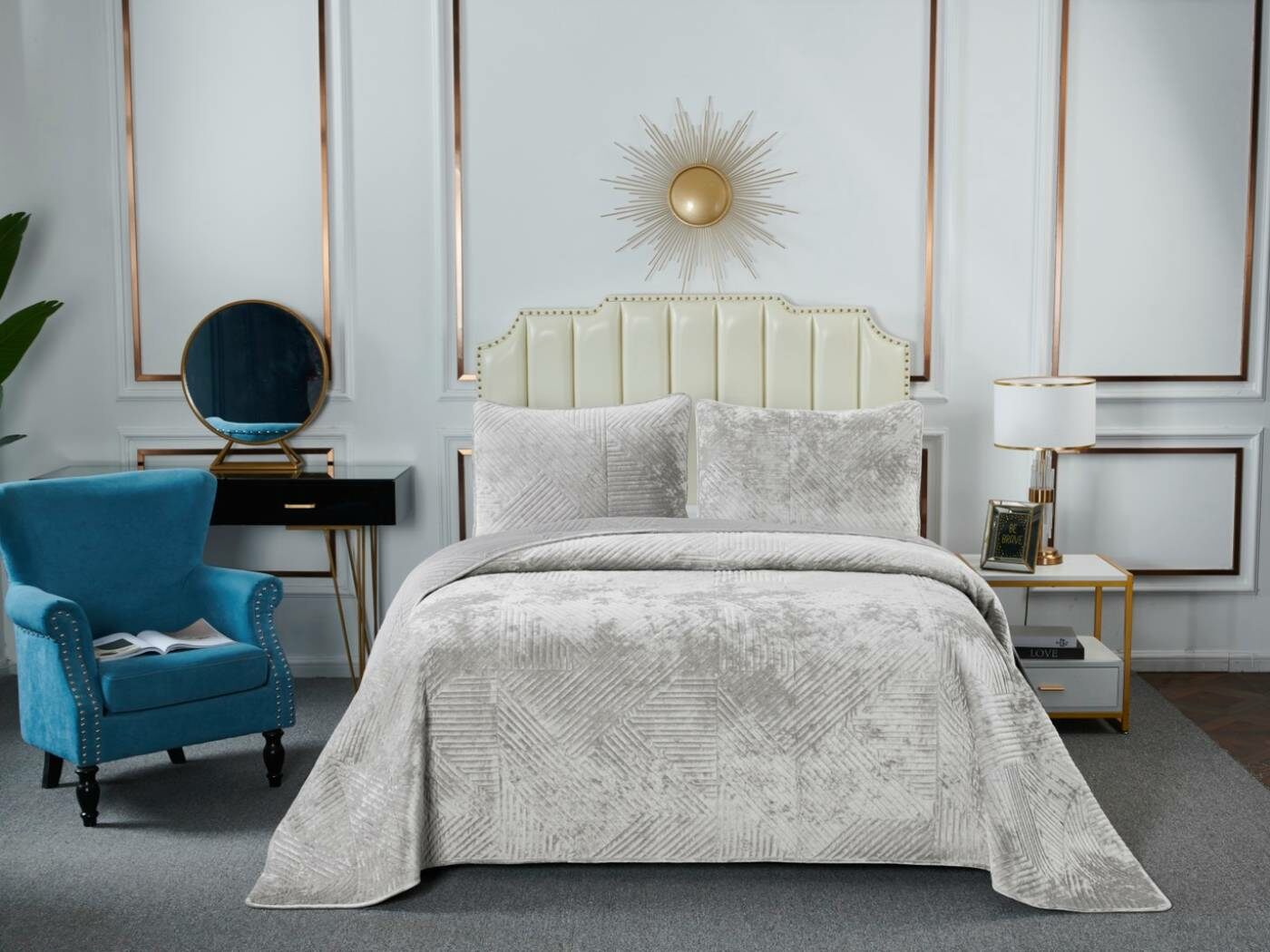 Покрывало украшает лаконичный геометрический орнамент. Геометрия всегда была и остаётся актуальной классикой. Конфигурация различных фигур, углов и линий позволяет им органично вписаться в самые разнообразные интерьерные стили.