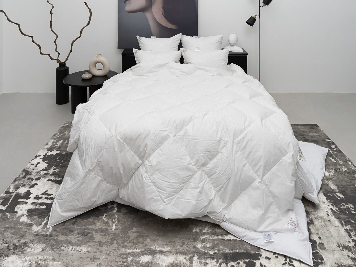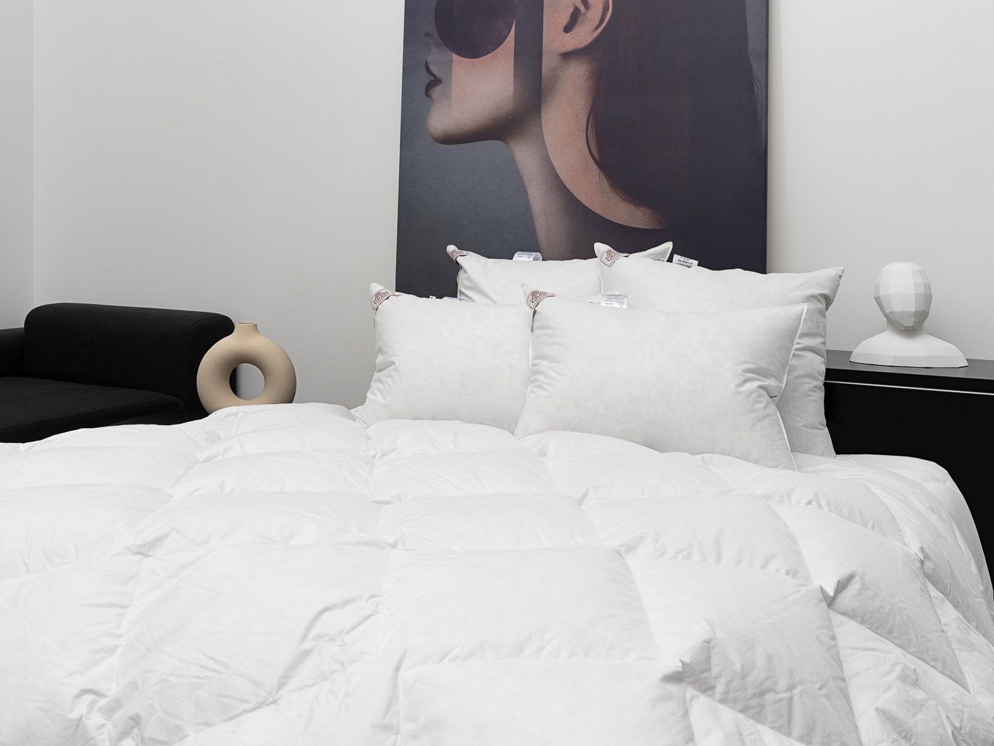 Ткань чехлов произведена известной компанией Weidmann (Зюссен, Германия), это – хлопчатобумажный пуходержащий ТИК (Mako-Cambric) с параметрами конструкции Nm 70/40, TC 251 и обладающий всеми свойствами, присущими подобного рода тканям: повышенные – гигроскопичность, плотность, долговечность и воздухопроницаемость. В коллекции используются пуховый наполнитель категории «Экстра» с небольшим добавлением мелкого пера, которое повышает упругость наполнителя и придает изделию необходимый объем.